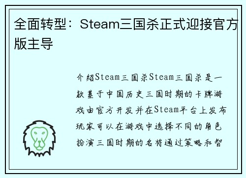 Steam三国杀是一款基于中国历史三国时期的卡牌游戏,由官方开发并在Steam平台上发布。玩家可以在游戏中选择不同的角色扮演三国时期的名将,通过策略和智慧来击败其他玩家,最终实现统一天下的目标。本文将介绍如何将非官方版本的三国杀换成官方版本,以获得更好的游戏体验。